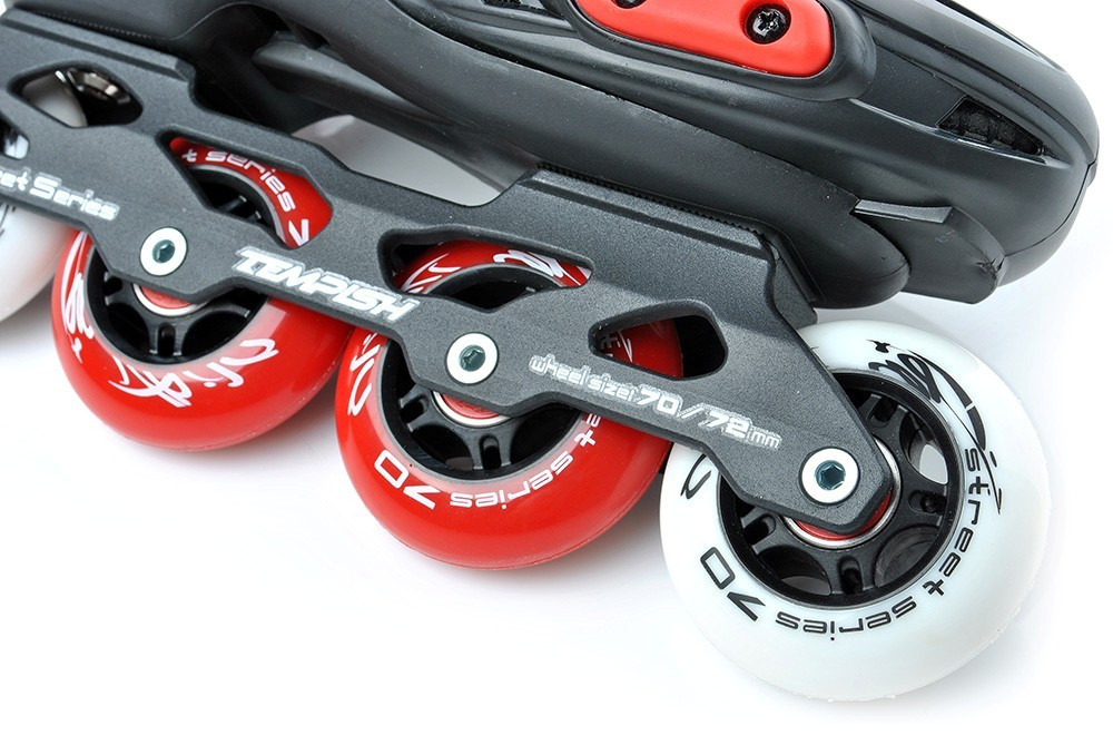 Die äußeren Spannschutzvorrichtungen sind mit zwei Schrauben befestigt und können bei Beschädigung ausgetauscht werden. Im Skelett unter der Ferse befindet sich ein Stoßdämpfer, der die Übertragung von Unebenheiten auf dem Weg zum Fuß absorbiert und dämpft und die Fahrt komfortabler und sicherer macht. Das COCTAIL VARIO-Set enthält außerdem 2 Paar Stoßdämpfer, 2 Paar Schnürsenkel, jeweils in Hellblau und Gelbgrün. Mit diesem Zubehör kann jeder seine Skates nach seinen Vorstellungen, Gefühlen und Stimmungen individualisieren. Der Austausch dieser Teile dauert nur wenige Minuten. Es handelt sich um einen sehr hochwertigen Kinder-Skate, der mit RADICAL 4x70mm-Rädern und ABEC 7-Chromstahllagern ausgestattet ist - abnehmbar mit Gummipads. Die Konstruktion des Skeletts und des Chassis ist für eine einfache Kontrolle des Skates und Freestyle ausgelegt Tricks. Das Chassis kann vorne individuell angepasst werden, je nach Fahrstil oder Schwerpunkt des Skaters. Steigung der Befestigungsschrauben 150 mm.