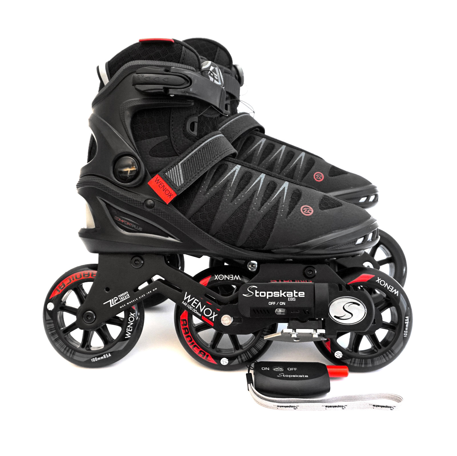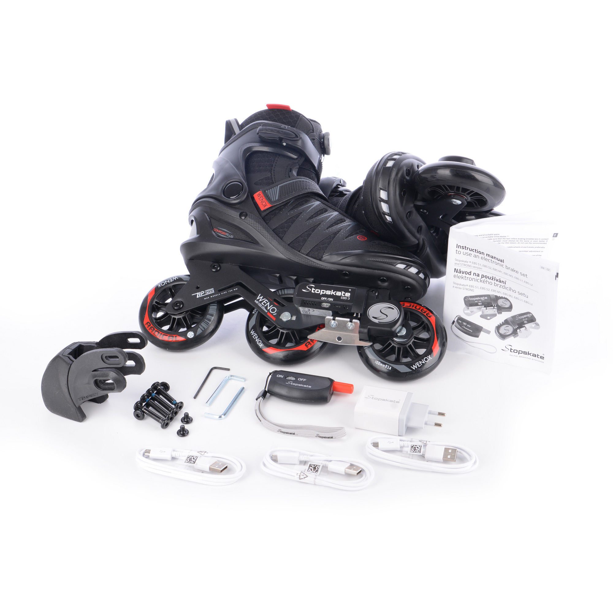 Die Skates sind mit einem revolutionären elektromechanischen Bremssystem ausgestattet, das von einer drahtlosen Steuerung gesteuert wird. Das Bremsen auf diesen Schlittschuhen ist jetzt komfortabler, sicherer, einfacher und effizienter als die klassische Bremse hinter dem Hinterrad! Dieses Modell mit EBS Strong-Bremse wird für Benutzer mit einem höheren Gewicht von bis zu 110 kg empfohlen. Weitere Informationen zu diesem patentierten tschechischen Produkt finden Sie unter: www.stopskate.com