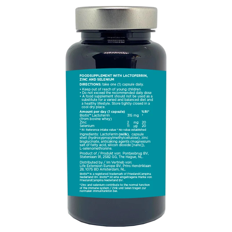 • Der Lactoferrin-Komplex enthält die Mineralien Zink und Selen, um die Immuneigenschaften von Lactoferrin zu stärken.