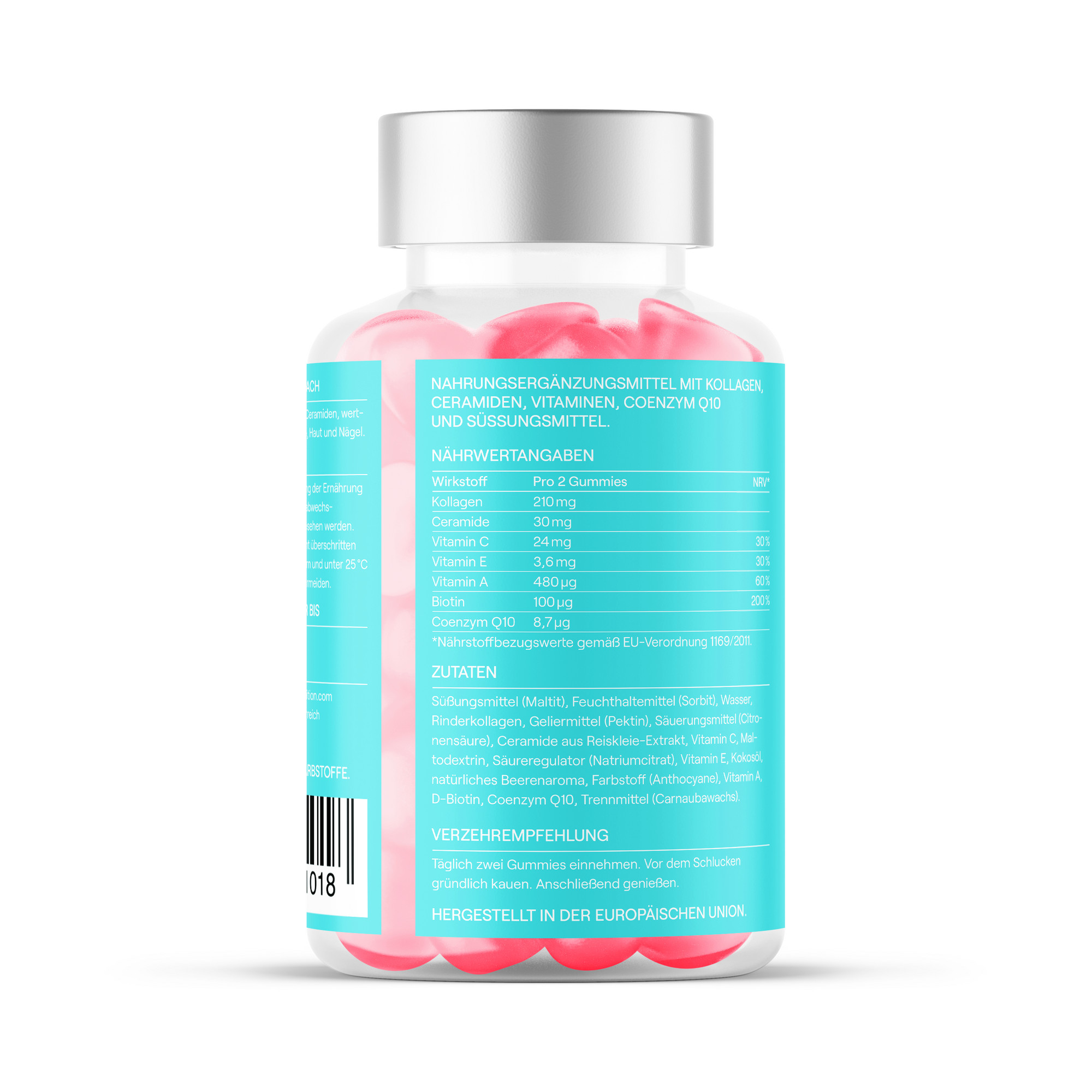 Süßungsmittel (Maltit) • Feuchthaltemittel (Sorbit) • Wasser • Rinderkollagen • Geliermittel (Pektin) • Säuerungsmittel (Zitronensäure) • Ceramide aus Reiskleieextrakt • Vitamin C • Maltodextrin • Säureregulator (Natriumcitrat) • Vitamin E • Kokosöl • natürliches Beerenaroma • Farbstoff (Anthocyane) • Vitamin A • D-Biotin • Coenzym Q10 • Trennmittel (Carnaubawachs)