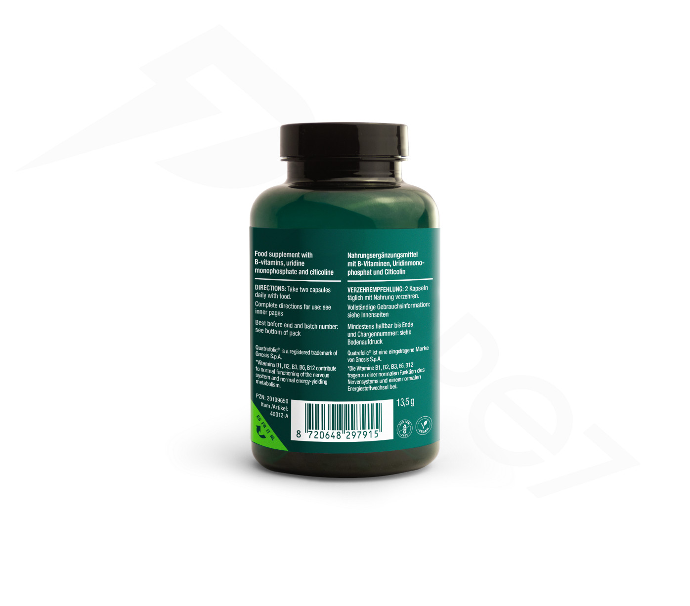 Capsule shell: hydroxypropyl methylcellulose • nicotinamide • D-panthenate calcium • riboflavin 5'-phosphate sodium • thiamine hydrochloride • citicoline • uridine 5'-monophosphate • biotin • pyridoxal 5'-phosphate • glucosamine salt of 5-methyltetrahydrofolate • methylcobalamin • adenosylcobalamin non-GMO Quatrefolic® is a registered trademark of Gnosis S.p.A
